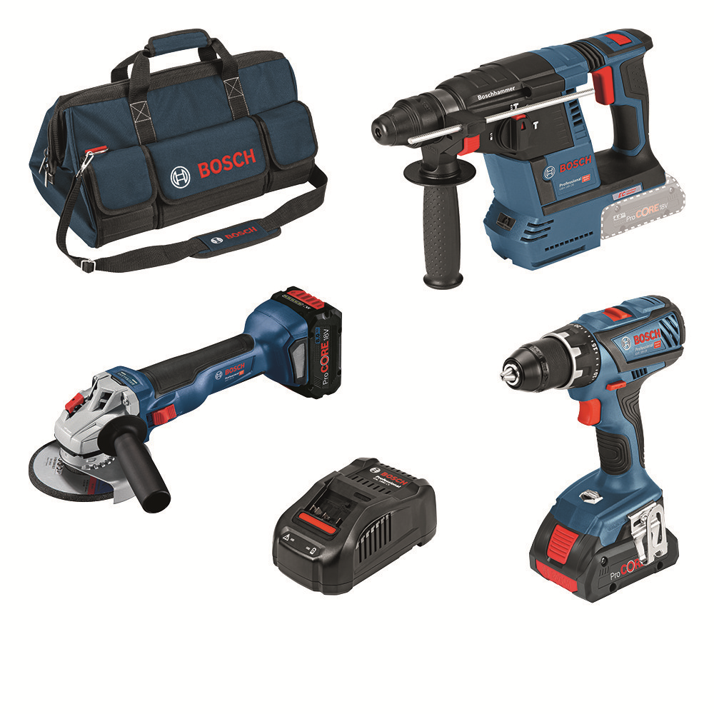 • Kombinovaná sada 3 dílů nářadí: 18V: GSR + GWS + GBH + 2 x ProCORE18V (1 x 4,0Ah + 1 x 8,0Ah) + GAL + brašna na nářadí
