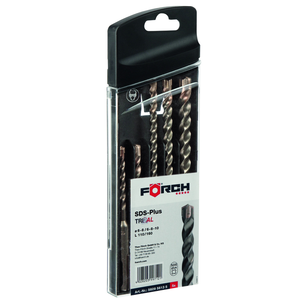 • vždy po 1 kuse - úderový vrták TRIAL s upínáním SDS plus 6x110/50, 8x110/50, 6x160/100, 8x160/100, 10x160/100 mm