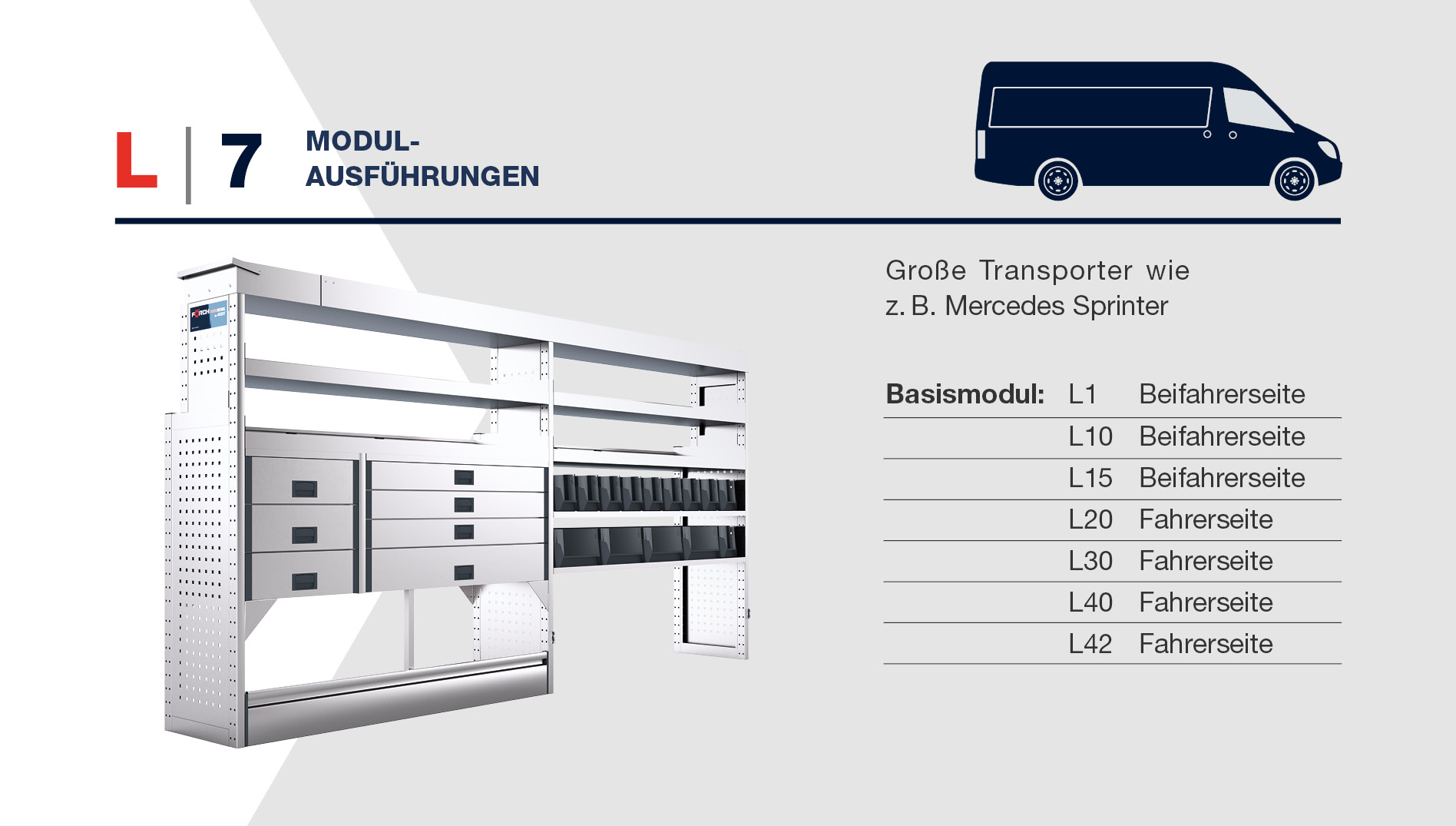 Vďaka výkonným zásuvkám s plným výsuvom unesú zásuvky v závislosti od konštrukcie 40 až 80 kg a môžu byť flexibilne vyplnené protišmykovými podložkami, plastovými boxmi alebo penovými vložkami.